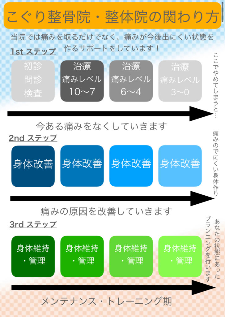 痛みを取るだけではまた、元に戻ってしまうので身体の根本的な改善・メンテナスを伝えるところ