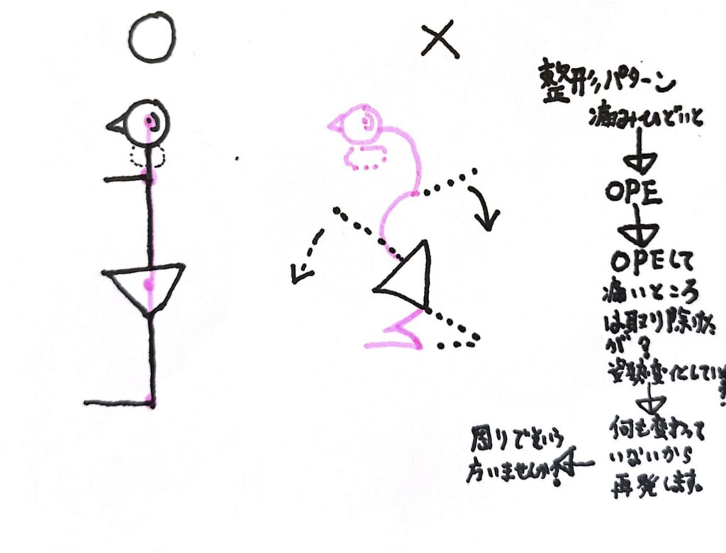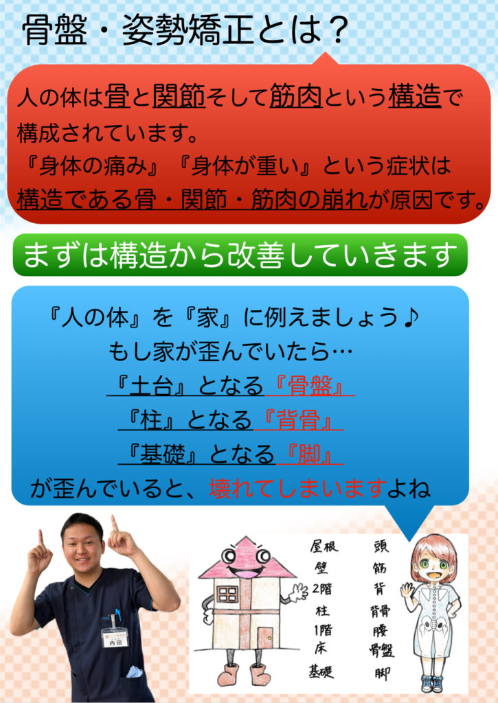 家に例えて説明。例えば家が地震が起き床(地面)がひび割れ傾いた場合どこから直すか?床(地面)が身体でいう骨盤、柱が背骨、屋根が頭。この時家であれば床(地面)から直すはず。身体も一緒で骨盤から治さなくては根本的な改善にならず一時的な改善にしかならないことを伝える。