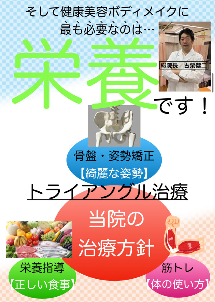 当院は骨盤(姿勢)・筋肉・栄養をベースに考え治療を行なっていく