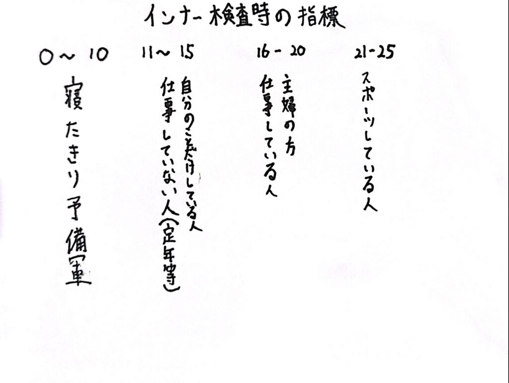 筋肉は大きく分けて2つに分かれます。アウターマッスルとインナーマッスルどちらも重要だが、ここではインナーの方を注力して話をする。インナーとアウターの絵を描き説明する。インナー検査を実施し患者さんのインナーがどれだけあるかを確認することを伝える。
