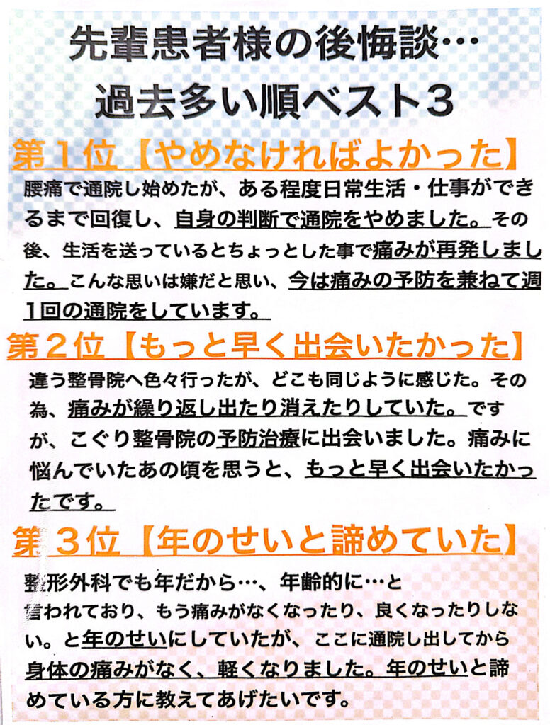 例:腰痛患者とすれば、◯◯さんと同じお年代の方で腰痛を訴えてきたのでもちろん同様に今日と同じような話や姿勢ついて話をさせてもらいましたが、仕事など忙しさで治療を受けませんでした。その半年後に再度腰痛で戻ってきましたが前回と比較してもかなり酷くなって戻ってご来院されたので一度整形に紹介することになりました。結果OPE(手術)しないといけないことになり、仕事もままならい状況になられました。その方が言っていたのはあの時無理をしてでもちゃんと治療しておけば良かったと言っていました。私たちが言いたいのは、同じ思いをしてほしくないというところと結果そうなってしまった時に結局仕事や家族に迷惑がかかってしまっていること手術などで医療費がかかってしまっているというのが現実です。