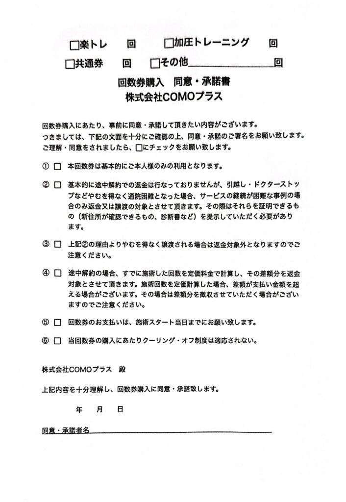 契約書と同意書を必ず巻く。契約書にて当日印鑑ない方は後日持ってきてもらった際に患者様控えを渡す(2枚)。同意書をの内容を一緒に確認しながら書いてもらう。特にクーリングオフ制度は適応されないことは伝える。契約書の裏にクーリングオフの事柄が書かれているが適応されないことを伝える。
